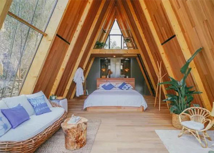 এই ত্রিভুজ কাঠের ঘরটির একটি অনন্য ত্রিভুজ আকৃতি রয়েছে। মেঝে গ্লাসের জানালা পুরো ঘরটিকে উজ্জ্বল এবং ভাল আলো দেয়। টেবিল এবং চেয়ারগুলি খোলা ডেকের উপর স্থাপন করা হয়,যা রাতের খাবারের পর বসে থাকার জন্য উপযুক্ত।এটিতে রান্নাঘর, বাথরুম, বেডরুম এবং লিভিং রুম রয়েছে।যা পর্যটকদের মনোরম এলাকায় আবাসন এবং হোটেল প্রকল্পের জন্য আরও উপযুক্তএটা একটা প্রাইভেট হাউসের জন্যও তৈরি করা যায়।