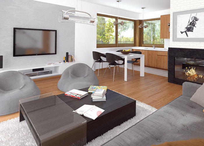 গ্রাউন্ড ফ্লোর অঞ্চল: 106.09 বর্গমিটার: এই স্তরটি দৈনন্দিন জীবনযাত্রা এবং বিনোদনের জন্য উত্সর্গীকৃত। এটি একটি উজ্জ্বল থাকার জায়গা, একটি কার্যকরী রান্নাঘর, একটি বাথরুম, গ্যারেজ এবং একটি শয়নকক্ষ - অতিথি ঘর বা হোম অফিসের জন্য উপযুক্ত।